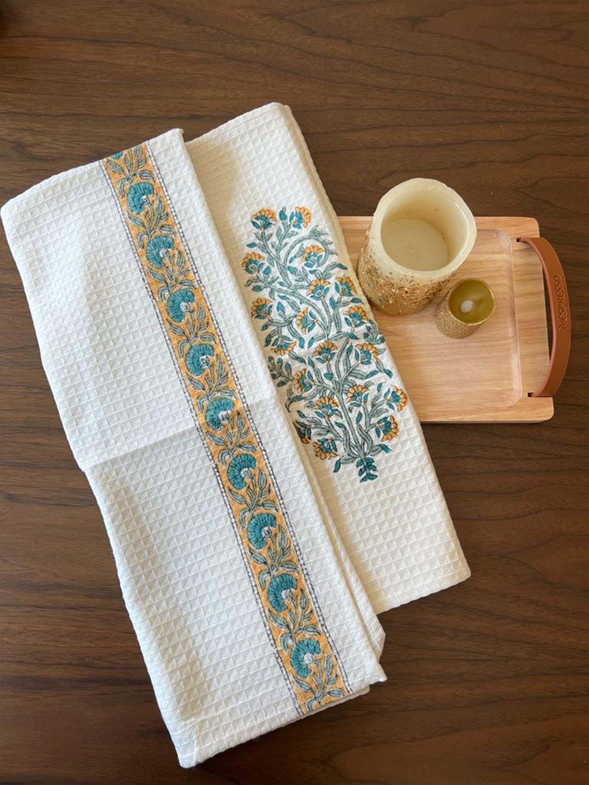 Introducing our exquisite collection of hand towels, meticulously crafted from 100% cotton and adorned with unique block prints. Each set comes in a pair, adding a touch of elegance and charm to your bathroom.